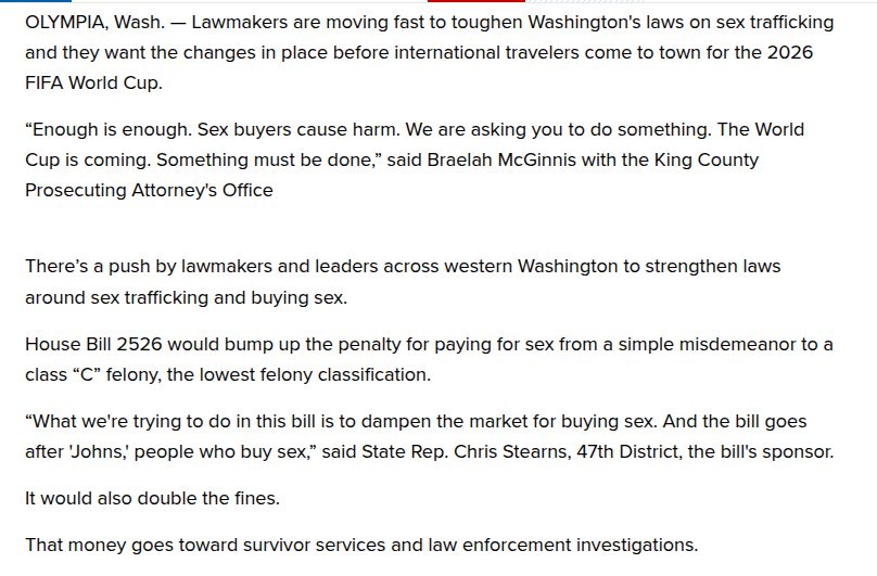 [Politicians] are moving fast to [worsen] Washington’s laws on [adults having consensual sex]…before international travelers come to town for the 2026 FIFA World Cup…the King County Prosecut[or’s office vomited decades-old prohibitionist propaganda at them to]…bump up…paying for sex from a simple misdemeanor to a…felony [because prosecutors aren’t ruining enough lives yet]…