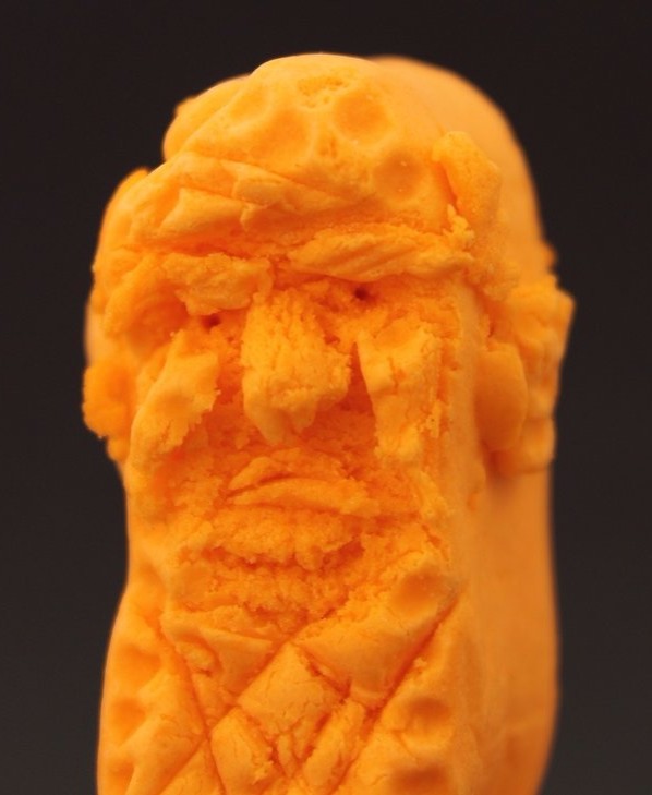 which displays both his weird proportions and his goofy awkwardness, and shows his mouth in its typical position: wide open and emitting a stream of noxious hot air. That vaguely-obscene flytrap is even more horrifyingly agape in the shot below, which also showcases his impeccable sartorial taste and the way his henchmen worship him; it’s followed by another shot in which he appears to be enjoying some unlucky insect which wandered in, and also really illustrates the healthy color and virile countenance of which his followers are so enamored. The third arrangement is a juxtaposition which, I think, effectively illustrates his unmistakable animal magnetism.